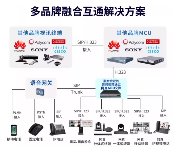1. 不同品牌直接设备互通:兼容华为、中兴、宝利通、亿联、科达、腾讯会议、钉钉、飞书等不同品牌多点控制单元MCU及硬件终端,无需淘汰现有设备。