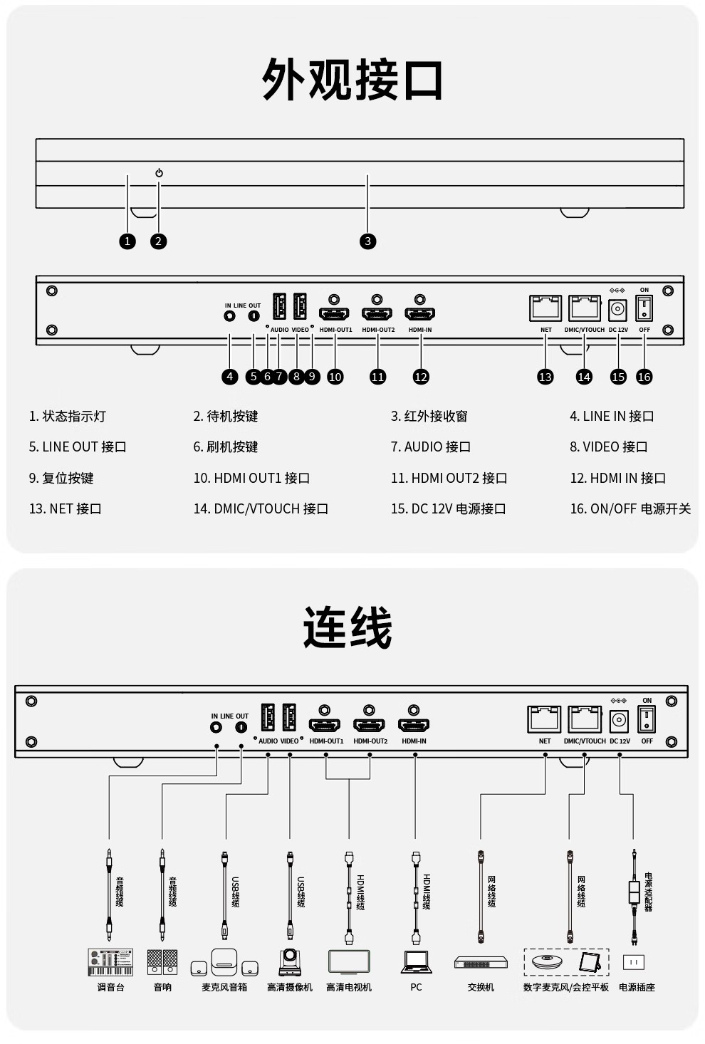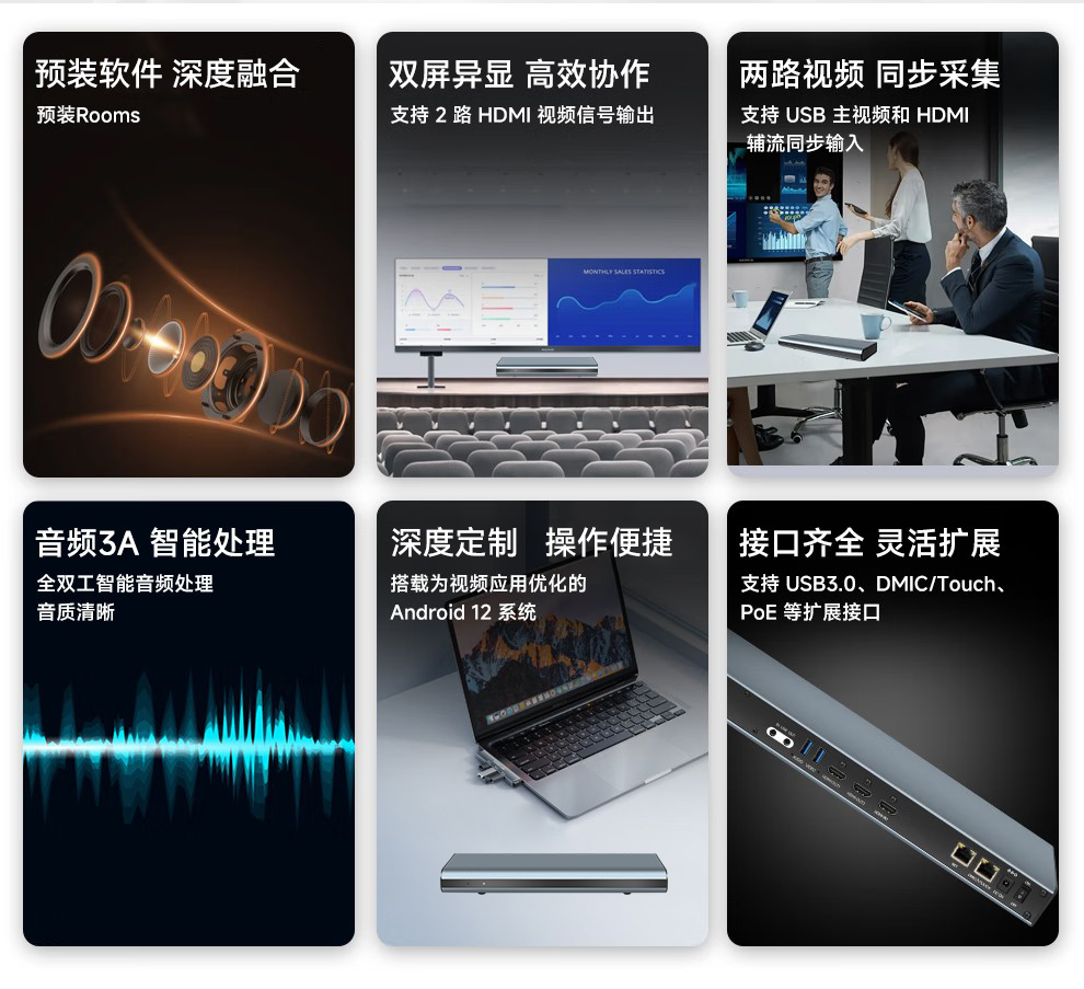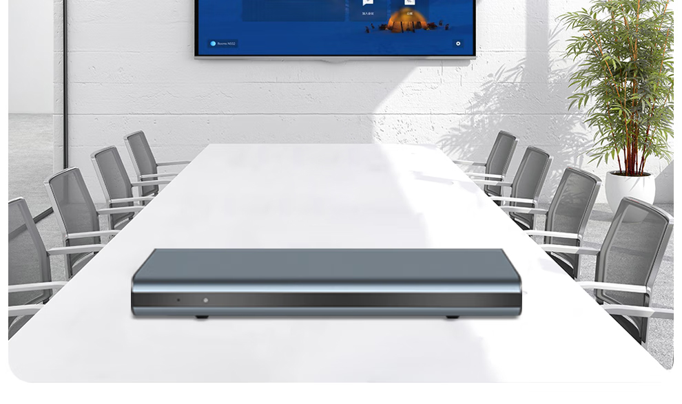 内嵌腾讯会议ROOMS或者钉钉会议ROOMS,开机即可进入相应系统登录界面,使用腾讯会议或者钉钉会议需在出厂前和销售确认。4核A76+4核A55,6TOPs AI NPU,Android 12系统,为视频应用深度定制开发,提供完善的开发文档和SDK。双路同时输入(1xUSB,1xHDMI);双路1080P同时输出(2xHDMI)。最高8K60FPS超强解码。 支持双路HDMI输出,可分别全屏显示主辅流。内置优秀的自动增益控制、自动回声消除、自动噪声抑制等音频处理。金属外壳,无风扇设计,保证高主频长期可靠运行。标配DDR 4GB, EMMC 16GB存储。4K超高清安卓分体终端,出厂标配腾讯会议ROOMS或者钉钉会议ROOMS。